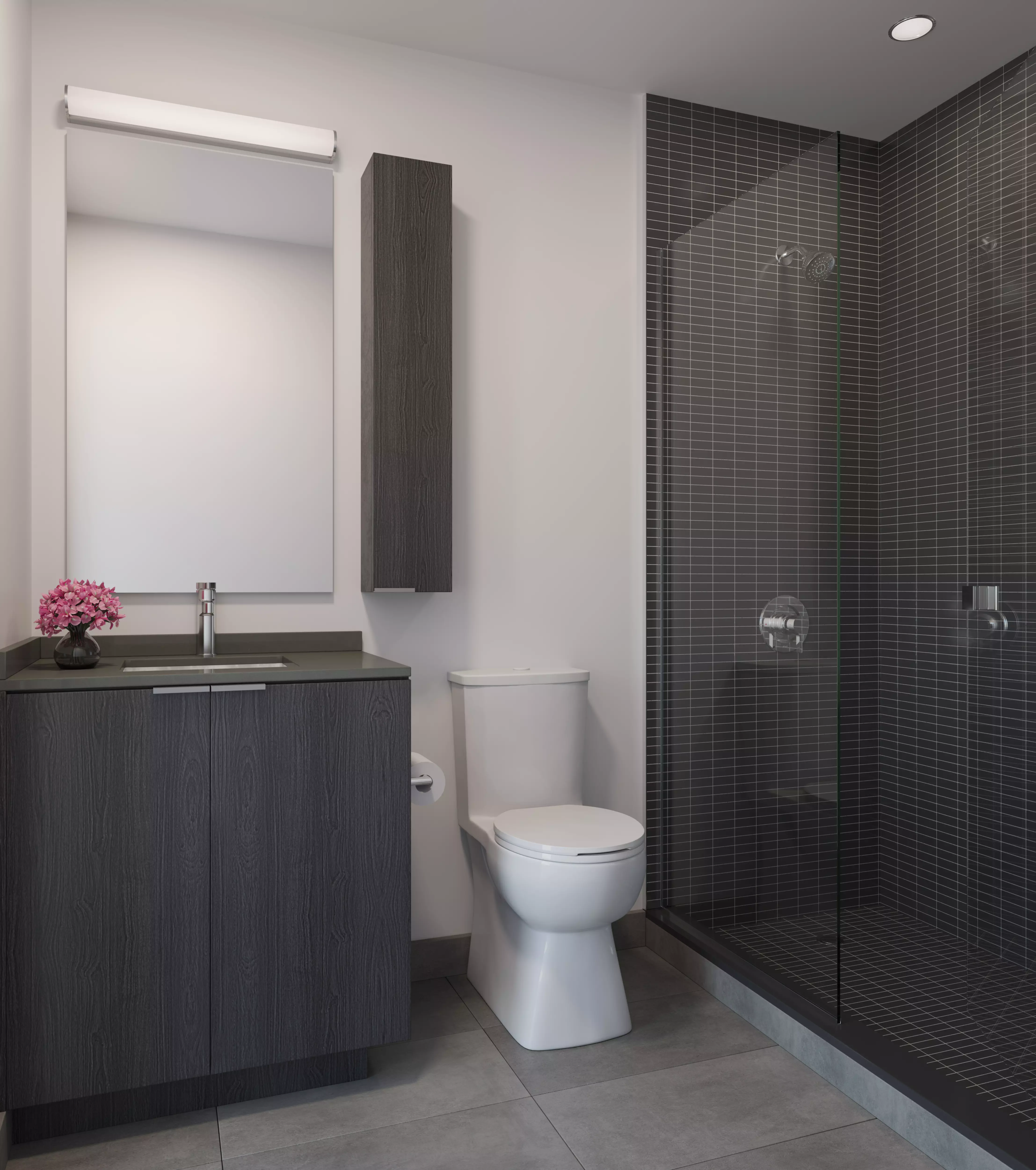 Custom-designed vanity with composite quartz counter and undermount sink in bathroom